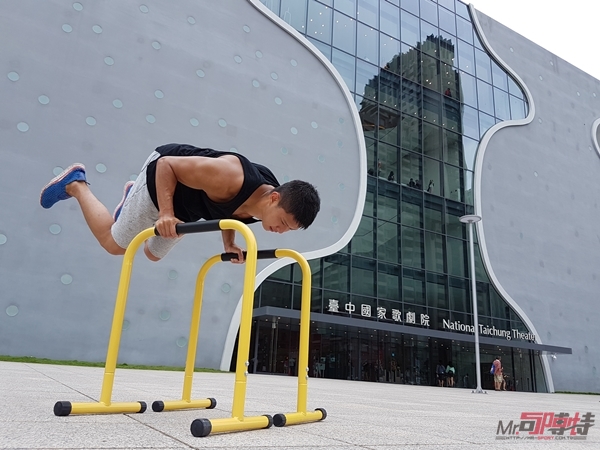 2.再來是操作過程中,要注意兩手間距,調整得好動作才能比較順暢。另外,因為腳偏長的關係,司博特有時使用雙槓會覺得卡,建議運動時盡量把腳提高收好。
