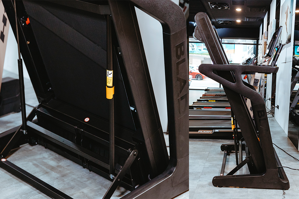 X7 則是搭載兩根氣壓桿,利用腳尖輕點緩降裝置,雙桿就會穩定的自動下降,另外當然就是基本的摺疊功能,黃金三角揚升結構,讓跑步機能更節省空間,摺疊後可釋放約70%的空間。